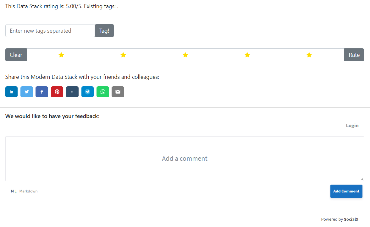 On this page, you can also add your custom tags, give your rating, share the data solution blueprint with your colleagues and friends, and add your comments.